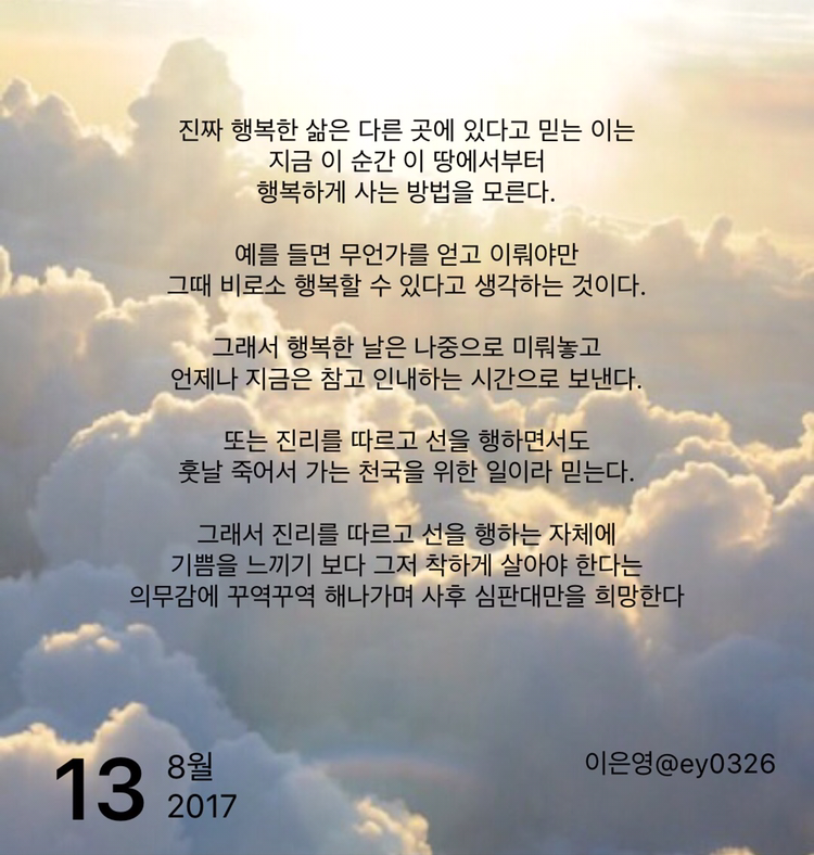 그래서 행복한 날은 나중으로 미뤄놓고 언제나 지금은 참고 인내하는 시간으로 보낸다.