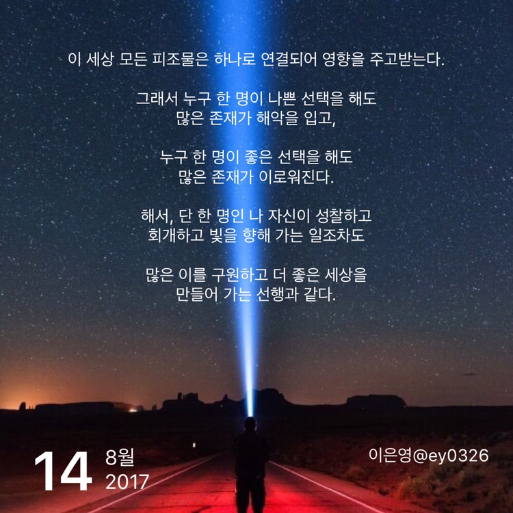 이 세상 모든 피조물은 하나로 연결되어 영향을 주고받는다.그래서 누구 한 명이 나쁜 선택을 해도많은 존재가 해악을 입고,누구 한 명이 좋은 선택을 해도많은 존재가 이로워진다.해서, 단 한 명인 나 자신이 성찰하고회개하고 빛을 향해 가는 일조차도많은 이를 구원하고 더 좋은 세상을 만들어 가는 선행과 같다.