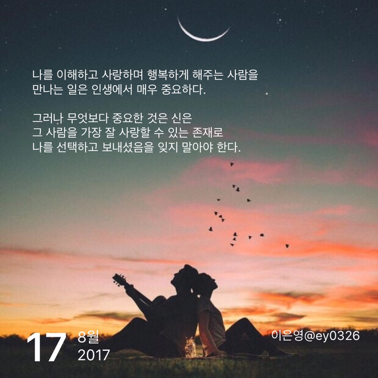 나를 이해하고 사랑하며 행복하게 해주는 사람을 만나는 일은 인생에서 매우 중요하다.그러나 무엇보다 중요한 것은 신은그 사람을 가장 잘 사랑할 수 있는 존재로 나를 선택하고 보내셨음을 잊지 말아야 한다.
