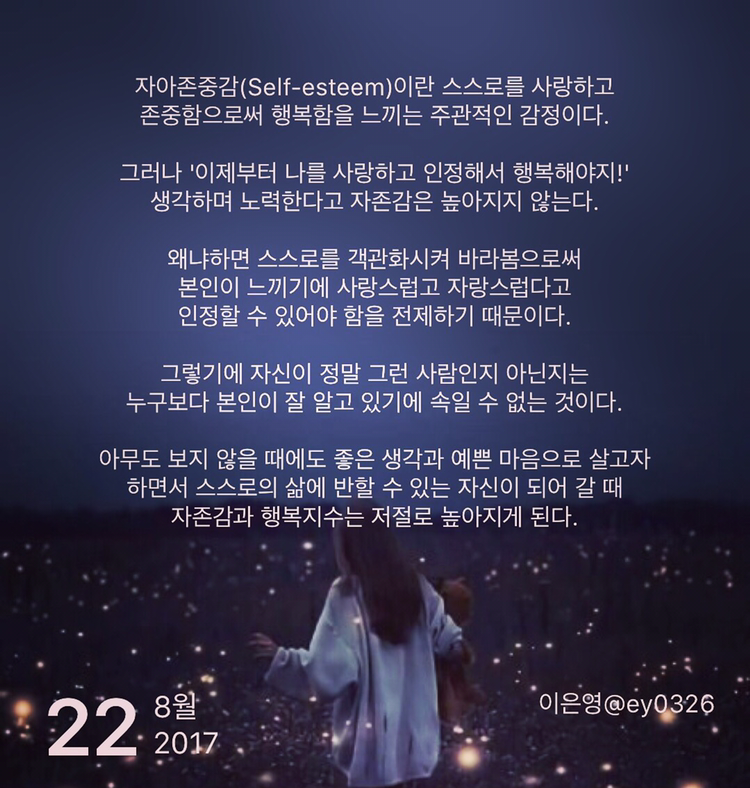 아무도 보지 않을 때에도 좋은 생각과 예쁜 마음으로 살고자 하면서 스스로의 삶에 반할 수 있는 자신이 되어 갈 때 자존감과 행복지수는 저절로 높아지게 된다.