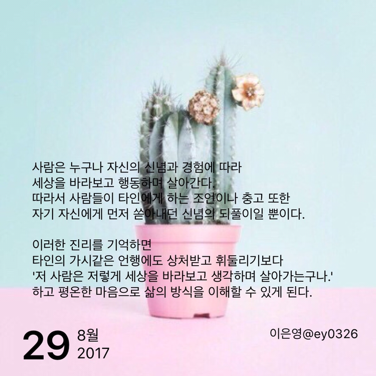 사람은 누구나 자신의 신념과 경험에 따라 세상을 바라보고 행동하며 살아간다. 따라서 사람들이 타인에게 하는 조언이나 충고 또한 자기 자신에게 먼저 쏟아내던 신념의 되풀이일 뿐이다.이러한 진리를 기억하면 타인의 가시같은 언행에도 상처받고 휘둘리기보다'저 사람은 저렇게 세상을 바라보고 생각하며 살아가는구나.' 하고 평온한 마음으로 삶의 방식을 이해할 수 있게 된다.