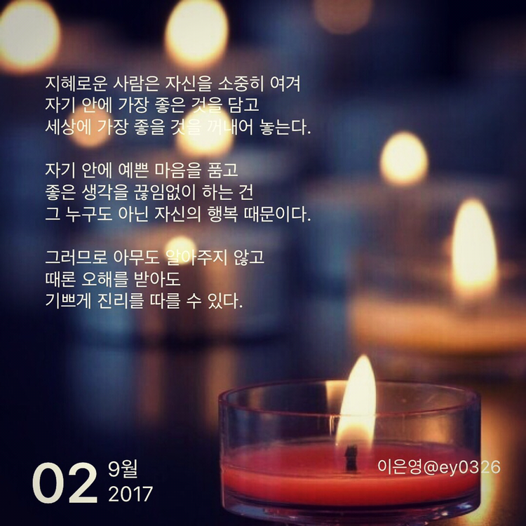지혜로운 사람은 자신을 소중히 여겨자기 안에 가장 좋은 것을 담고세상에 가장 좋을 것을 꺼내어 놓는다.자기 안에 예쁜 마음을 품고좋은 생각을 끊임없이 하는 건그 누구도 아닌 자신의 행복 때문이다.그러므로 아무도 알아주지 않고 때론 오해를 받아도 기쁘게 진리를 따를 수 있다.