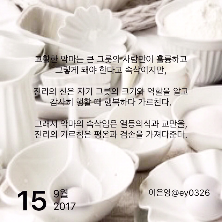교활한 악마는 큰 그릇의 사람만이 훌륭하고그렇게 돼야 한다고 속삭이지만,진리의 신은 자기 그릇의 크기와 역할을 알고 감사히 행할 때 행복하다 가르친다.그래서 악마의 속삭임은 열등의식과 교만을,진리의 가르침은 평온과 겸손을 가져다준다.