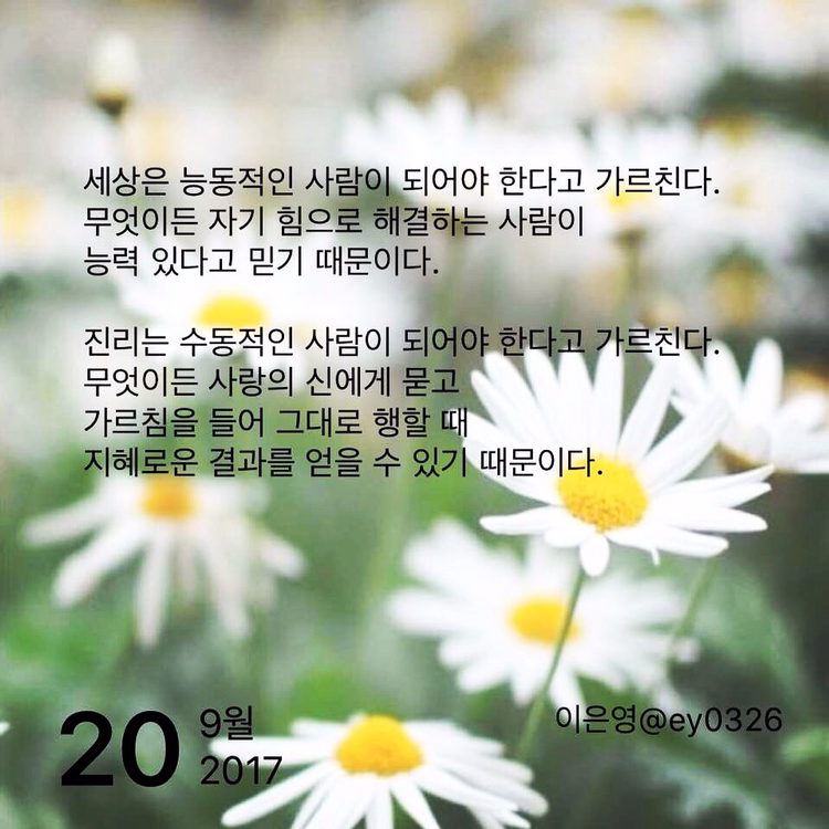 세상은 능동적인 사람이 되어야 한다고 가르친다.무엇이든 자기 힘으로 해결하는 사람이능력 있다고 믿기 때문이다.진리는 수동적인 사람이 되어야 한다고 가르친다.무엇이든 사랑의 신에게 묻고 가르침을 들어 그대로 행할 때 지혜로운 결과를 얻을 수 있기 때문이다.