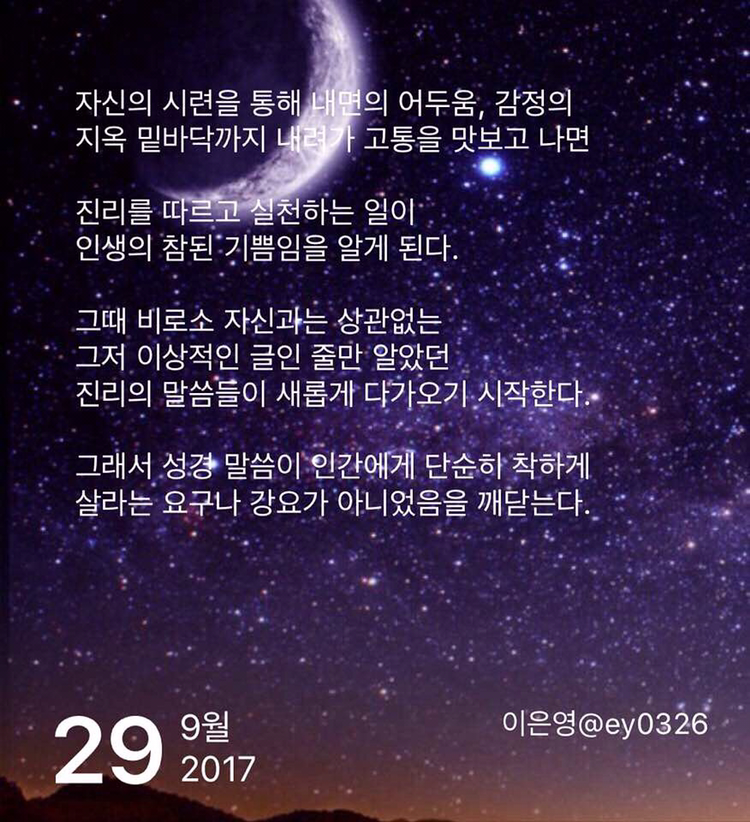 자신의 시련을 통해 내면의 어두움, 감정의지옥 밑바닥까지 내려가 고통을 맛보고 나면진리를 따르고 실천하는 일이 인생의 참된 기쁨임을 알게 된다.그때 비로소 자신과는 상관없는 그저 이상적인 글인 줄만 알았던 진리의 말씀들이 새롭게 다가오기 시작한다.그래서 성경 말씀이 인간에게 단순히 착하게 살라는 요구나 강요가 아니었음을 깨닫는다.
