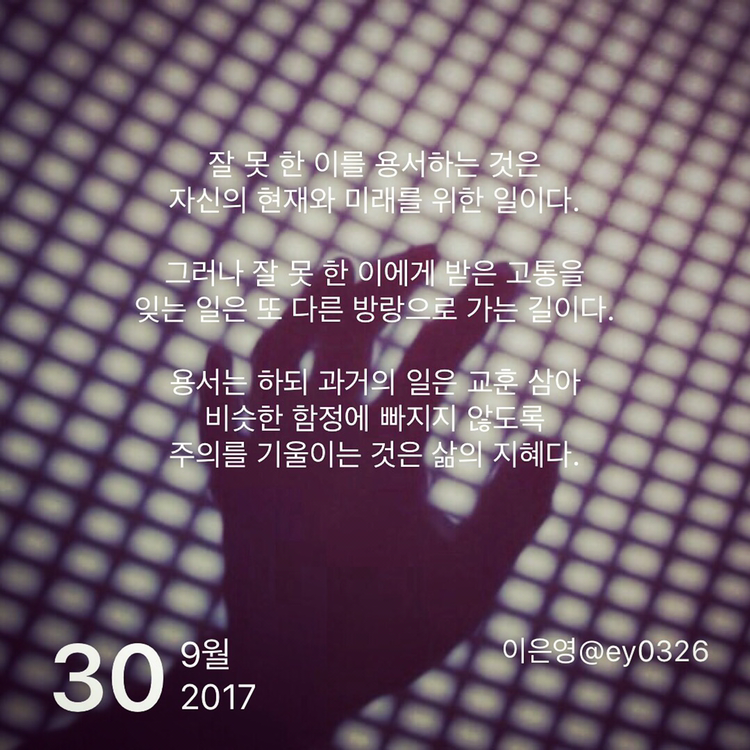 잘 못 한 이를 용서하는 것은 자신의 현재와 미래를 위한 일이다.그러나 잘 못 한 이에게 받은 고통을잊는 일은 또 다른 방랑으로 가는 길이다.용서는 하되 과거의 일은 교훈 삼아 비슷한 함정에 빠지지 않도록 주의를 기울이는 것은 삶의 지혜다.