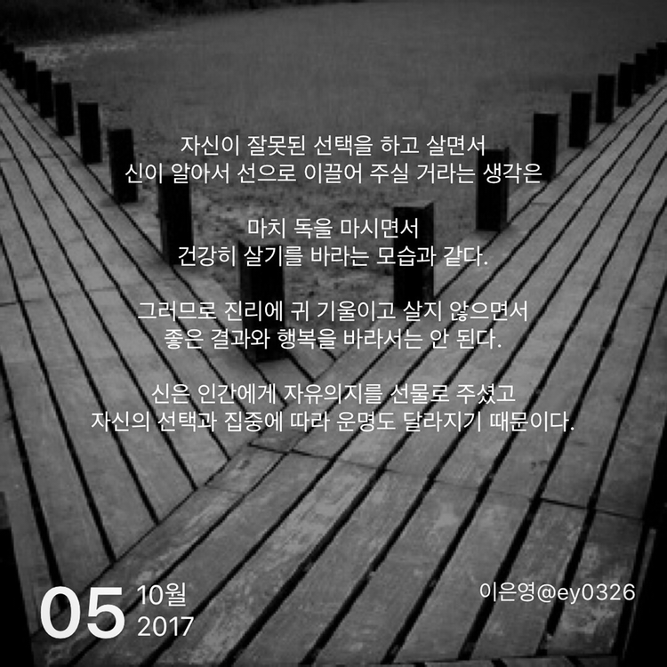 자신이 잘못된 선택을 하고 살면서신이 알아서 선으로 이끌어 주실 거라는 생각은마치 독을 마시면서건강히 살기를 바라는 모습과 같다.그러므로 진리에 귀 기울이고 살지 않으면서좋은 결과와 행복을 바라서는 안 된다.신은 인간에게 자유의지를 선물로 주셨고자신의 선택과 집중에 따라 운명도 달라지기 때문이다.