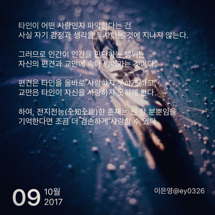타인이 어떤 사람인지 파악한다는 건 사실 자기 감정과 생각을 투사하는 것에 지나지 않는다.그러므로 인간이 인간을 판단하는 행위는자신의 편견과 교만에 속아 넘어가는 것이다.편견은 타인을 올바로 사랑하지 못하게 하고, 교만은 타인이 자신을 사랑하지 못하게 한다.하여, 전지전능(全知全能)한 존재는 신 한 분뿐임을 기억한다면 조금 더 겸손하게 사랑할 수 있다.