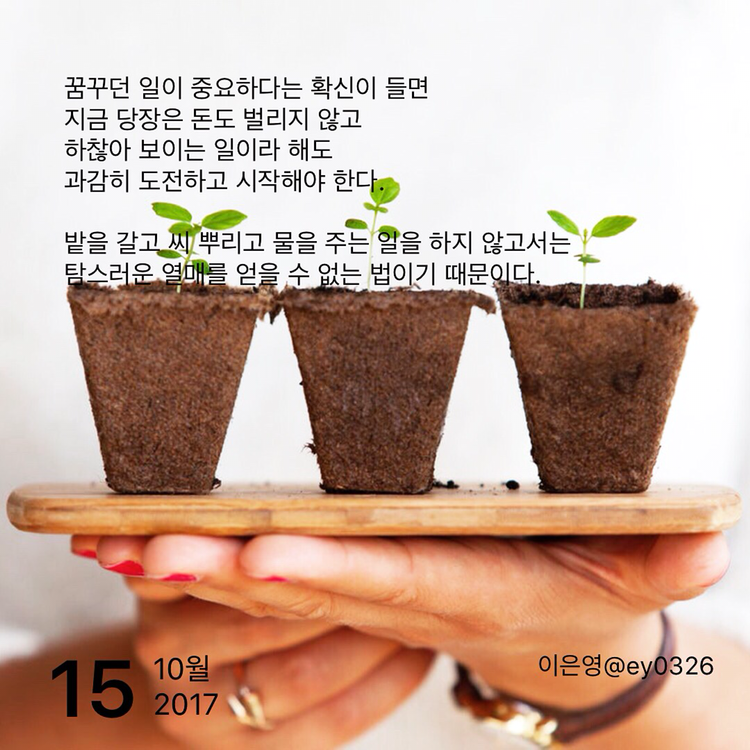 꿈꾸던 일이 중요하다는 확신이 들면지금 당장은 돈도 벌리지 않고하찮아 보이는 일이라 해도과감히 도전하고 시작해야 한다.밭을 갈고 씨 뿌리고 물을 주는 일을 하지 않고서는 탐스러운 열매를 얻을 수 없는 법이기 때문이다.