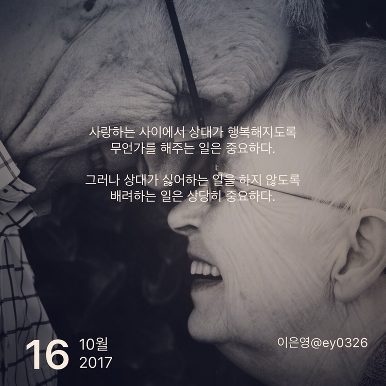 사랑하는 사이에서 상대가 행복해지도록 무언가를 해주는 일은 중요하다.그러나 상대가 싫어하는 일을 하지 않도록배려하는 일은 상당히 중요하다.