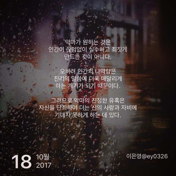 악마가 원하는 것은인간이 끊임없이 실수하고 죄짓게만드는 것이 아니다.오히려 인간의 나약함은 진리의 말씀에 더욱 매달리게하는 계기가 되기 때문이다.그러므로 악마의 진정한 유혹은자신을 단죄하여 더는 신의 사랑과 자비에기대지 못하게 하는 데 있다.