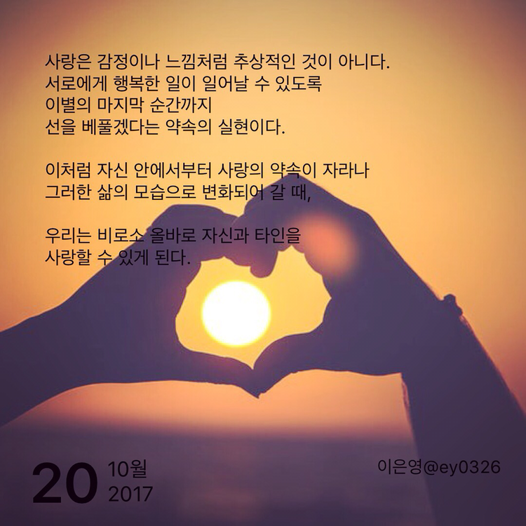 사랑은 감정이나 느낌처럼 추상적인 것이 아니다. 서로에게 행복한 일이 일어날 수 있도록 이별의 마지막 순간까지 선을 베풀겠다는 약속의 실현이다.이처럼 자신 안에서부터 사랑의 약속이 자라나 그러한 삶의 모습으로 변화되어 갈 때,우리는 비로소 올바로 자신과 타인을 사랑할 수 있게 된다.