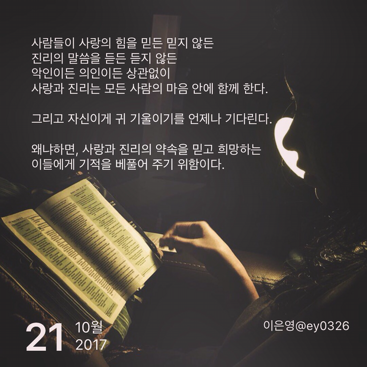사람들이 사랑의 힘을 믿든 믿지 않든진리의 말씀을 듣든 듣지 않든 악인이든 의인이든 상관없이사랑과 진리는 모든 사람의 마음 안에 함께 한다.그리고 자신이게 귀 기울이기를 언제나 기다린다.왜냐하면, 사랑과 진리의 약속을 믿고 희망하는 이들에게 기적을 베풀어 주기 위함이다.