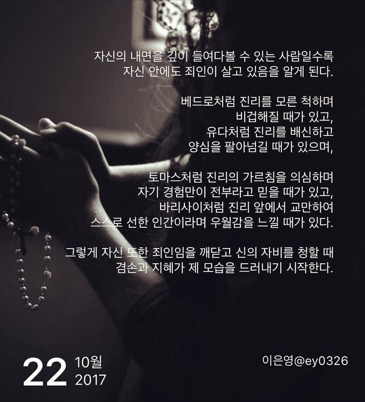 자신의 내면을 깊이 들여다볼 수 있는 사람일수록 자신 안에도 죄인이 살고 있음을 알게 된다.