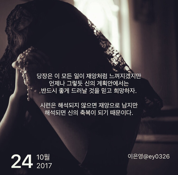 당장은 이 모든 일이 재앙처럼 느껴지겠지만언제나 그렇듯 신의 계획안에서는 반드시 좋게 드러날 것을 믿고 희망하자.시련은 해석되지 않으면 재앙으로 남지만해석되면 신의 축복이 되기 때문이다.