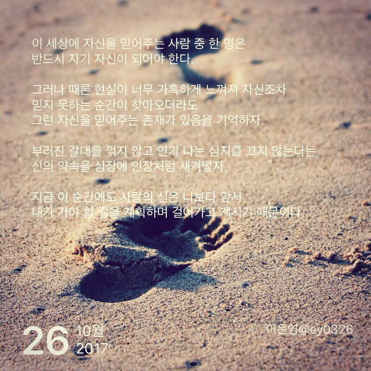 지금 이 순간에도 사랑의 신은 내가 가야 할 길을 앞서 계획하며 나를 엎고 걸어가시기 때문이다.