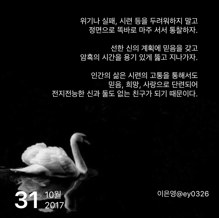위기나 실패, 시련 등을 두려워하지 말고 정면으로 똑바로 마주 서서 통찰하자.선한 신의 계획에 믿음을 갖고 용기 있게 뚫고 지나가자.인간의 삶은 시련의 고통을 통해서도믿음, 희망, 사랑으로 단련되어 전지전능한 신과 둘도 없는 친구가 되기 때문이다.