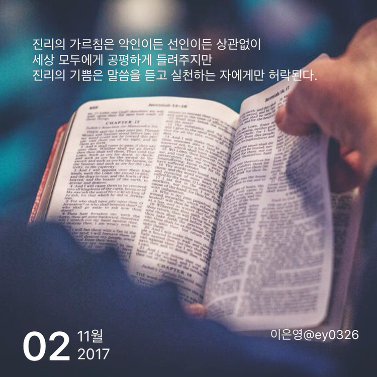 진리의 가르침은 악인이든 선인이든 상관없이 세상 모두에게 공평하게 들려주지만진리의 기쁨은 말씀을 듣고 실천하는 자에게만 허락된다.