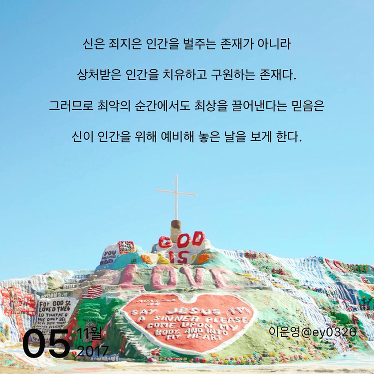 신은 죄지은 인간을 벌주는 존재가 아니라상처받은 인간을 치유하고 구원하는 존재다.그러므로 최악의 순간에서도 최상을 끌어낸다는 믿음은신이 인간을 위해 예비해 놓은 날을 보게 한다.