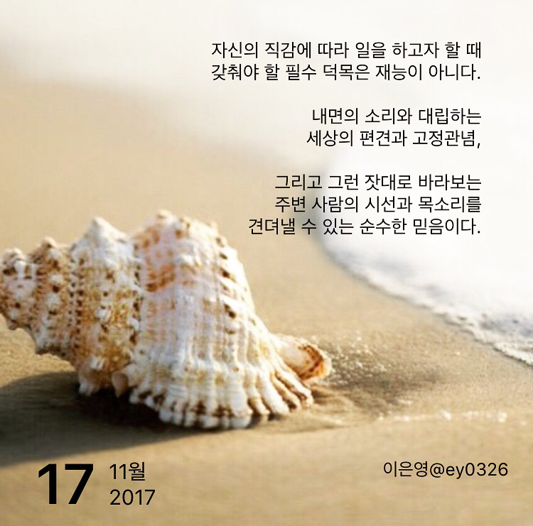 자신의 직감에 따라 일을 하고자 할 때 갖춰야 할 필수 덕목은 재능이 아니다.내면의 소리와 대립하는 세상의 편견과 고정관념,그리고 그런 잣대로 바라보는 주변 사람의 시선과 목소리를 견뎌낼 수 있는 순수한 믿음이다.