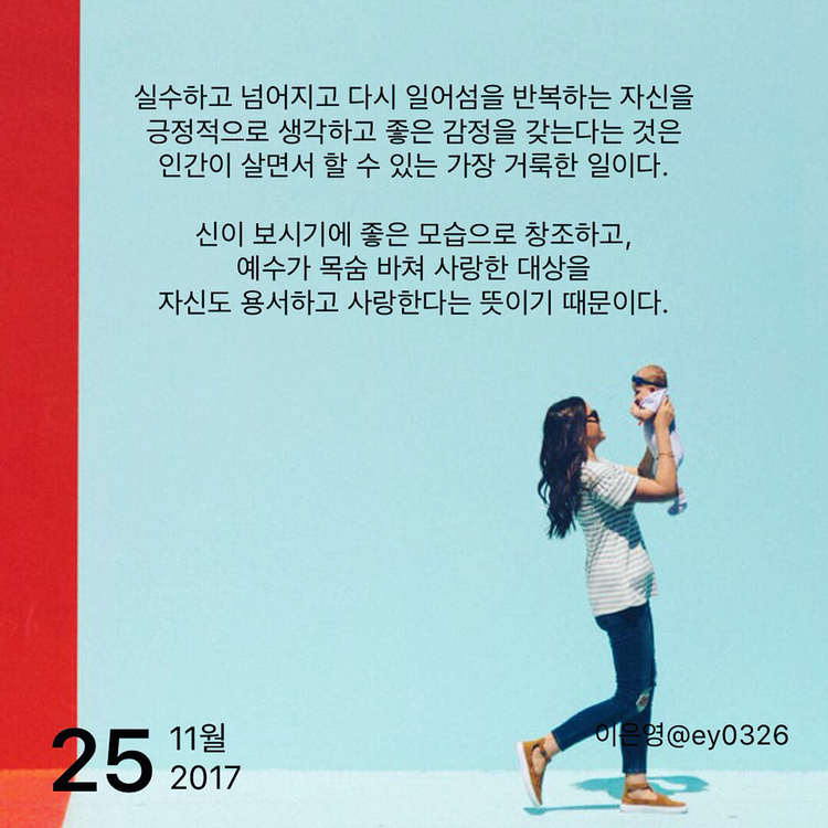 실수하고 넘어지고 다시 일어섬을 반복하는 자신을 긍정적으로 생각하고 좋은 감정을 갖는다는 것은 인간이 살면서 할 수 있는 가장 거룩한 일이다.신이 보시기에 좋은 모습으로 창조하고, 예수가 목숨 바쳐 사랑한 대상을 자신도 용서하고 사랑한다는 뜻이기 때문이다.