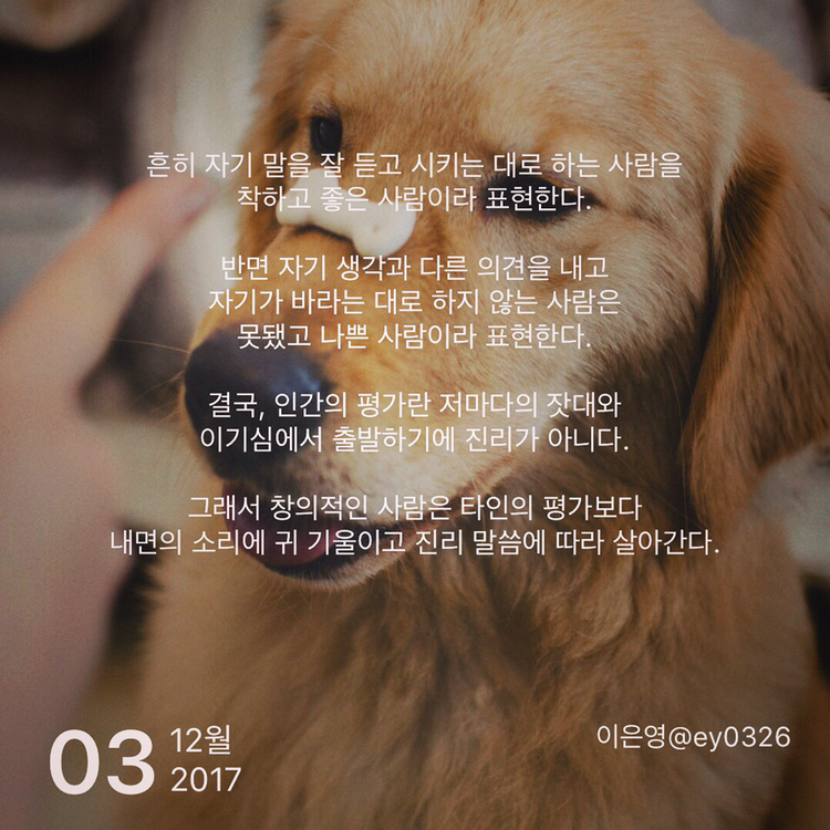 흔히 자기 말을 잘 듣고 시키는 대로 하는 사람을 착하고 좋은 사람이라 표현한다.반면 자기 생각과 다른 의견을 내고자기가 바라는 대로 하지 않는 사람은못됐고 나쁜 사람이라 표현한다.결국, 인간의 평가란 저마다의 잣대와 이기심에서 출발하기에 진리가 아니다.그래서 창의적인 사람은 타인의 평가보다 내면의 소리에 귀 기울이고 진리 말씀에 따라 살아간다.