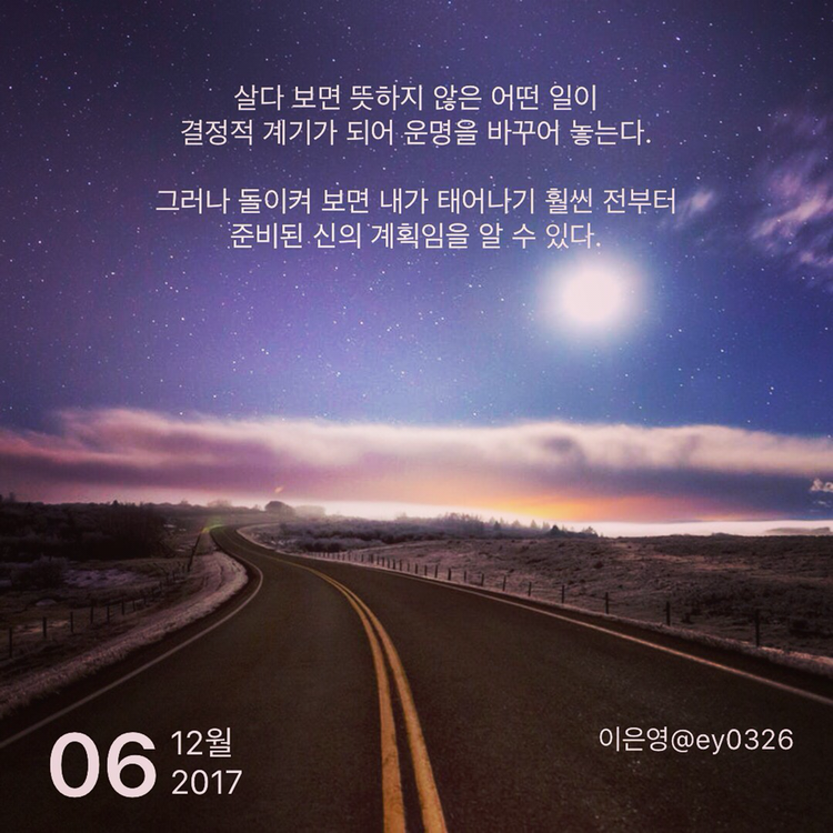 살다 보면 뜻하지 않은 어떤 일이 결정적 계기가 되어 운명을 바꾸어 놓는다.그러나 돌이켜 보면 내가 태어나기 훨씬 전부터 준비된 신의 계획임을 알 수 있다.