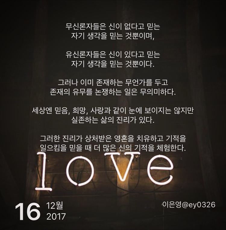 세상엔 믿음, 희망, 사랑과 같이 눈에 보이지는 않지만 실존하는 삶의 진리가 있다.