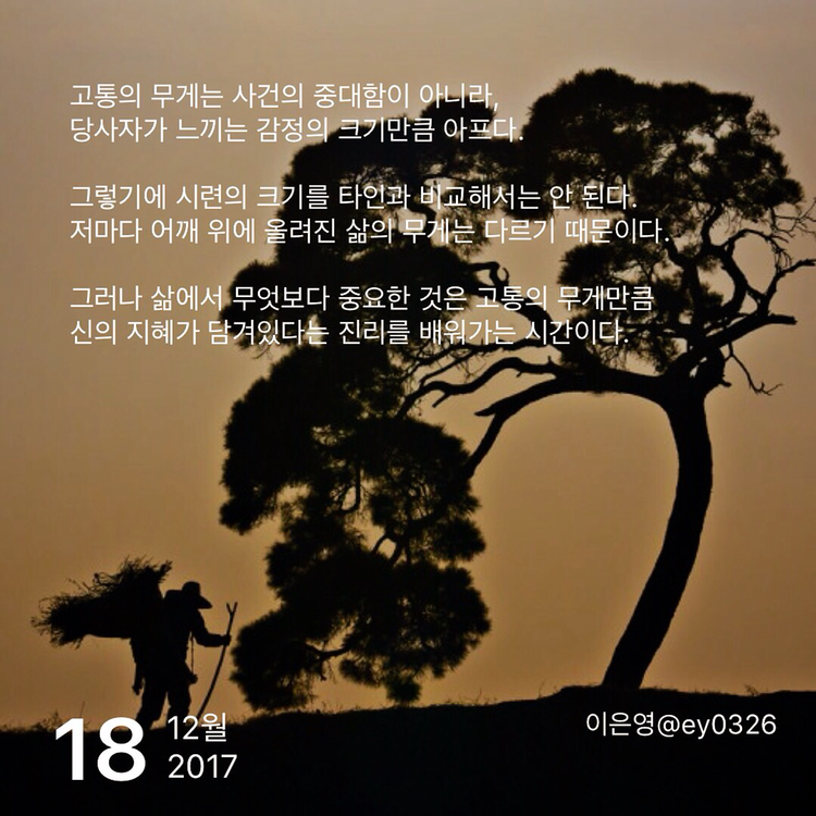 고통의 무게는 사건의 중대함이 아니라, 당사자가 느끼는 감정의 크기만큼 아프다.그렇기에 시련의 크기를 타인과 비교해서는 안 된다.저마다 어깨 위에 올려진 삶의 무게는 다르기 때문이다.그러나 삶에서 무엇보다 중요한 것은 고통의 무게만큼신의 지혜가 담겨있다는 진리를 배워가는 시간이다.