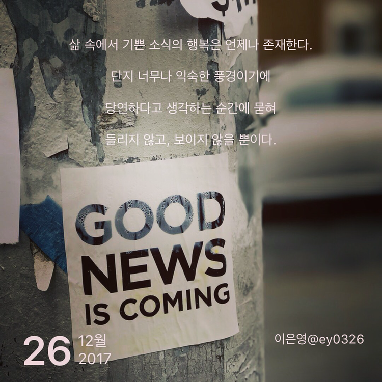 삶 속에서 기쁜 소식의 행복은 언제나 존재한다.단지 너무나 익숙한 풍경이기에당연하다고 생각하는 순간에 묻혀들리지 않고, 보이지 않을 뿐이다.