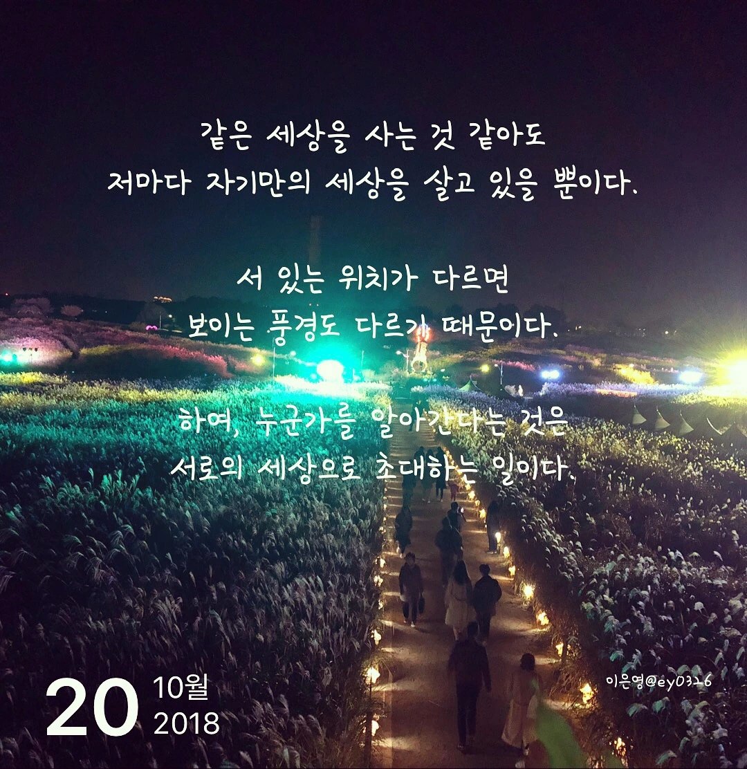 같은 세상을 사는 것 같아도저마다 자기만의 세상을 살고 있을 뿐이다.서 있는 위치가 다르면보이는 풍경도 다르기 때문이다.하여, 누군가를 알아간다는 것은서로의 세상으로 초대하는 일이다.