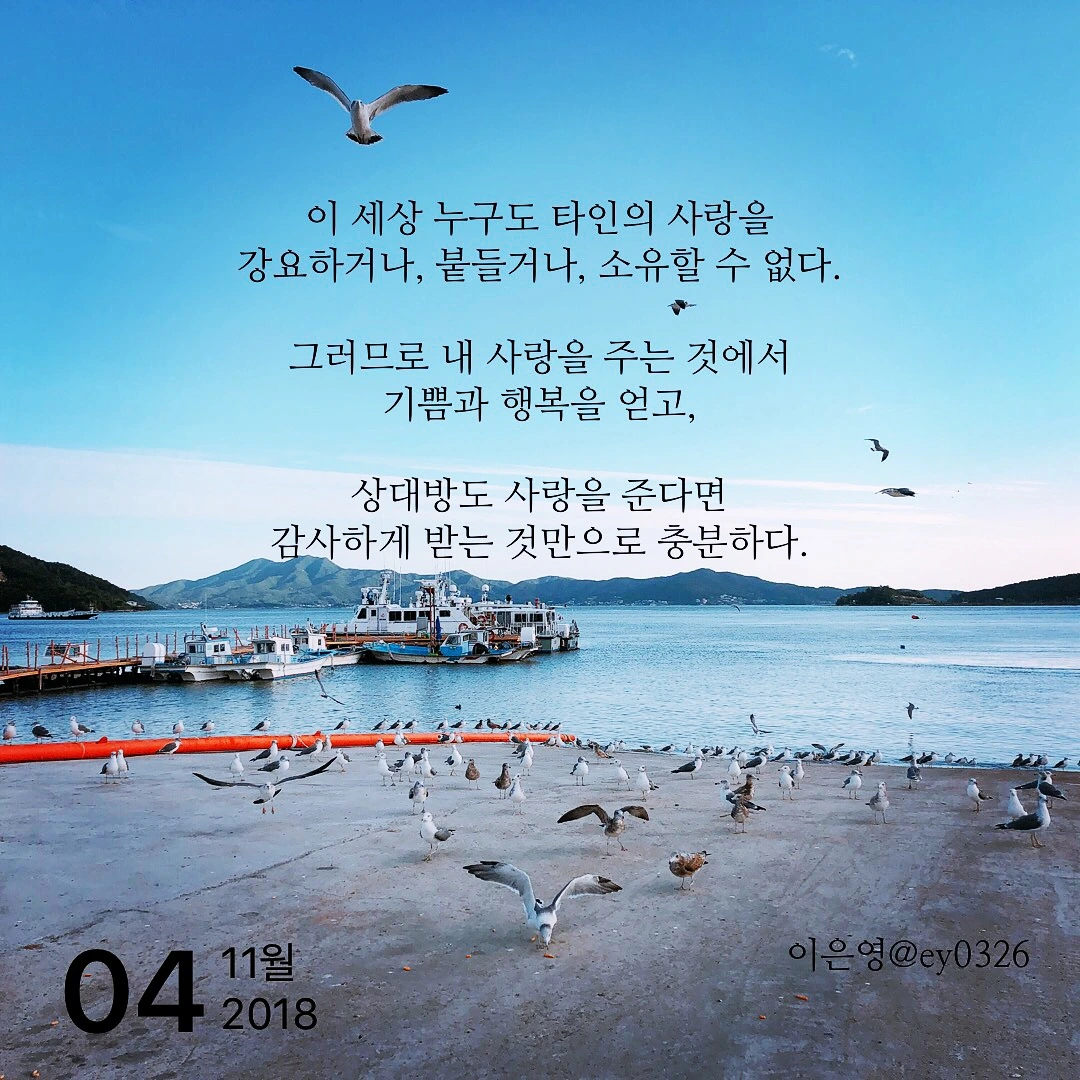 이 세상 누구도 타인의 사랑을 강요하거나, 붙들거나, 소유할 수 없다.그러므로 내 사랑을 주는 것에서기쁨과 행복을 얻고, 상대방도 사랑을 준다면감사하게 받는 것만으로 충분하다.