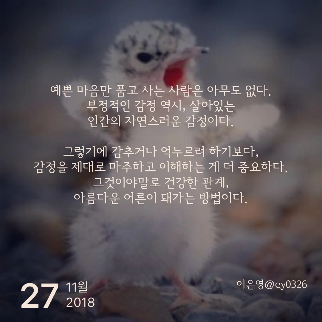 예쁜 마음만 품고 사는 사람은 아무도 없다.부정적인 감정 역시, 살아있는 인간의 자연스러운 감정이다.그렇기에 감추거나 억누르려 하기보다, 감정을 제대로 마주하고 이해하는 게 더 중요하다. 그것이야말로 건강한 관계,아름다운 어른이 돼가는 방법이다.