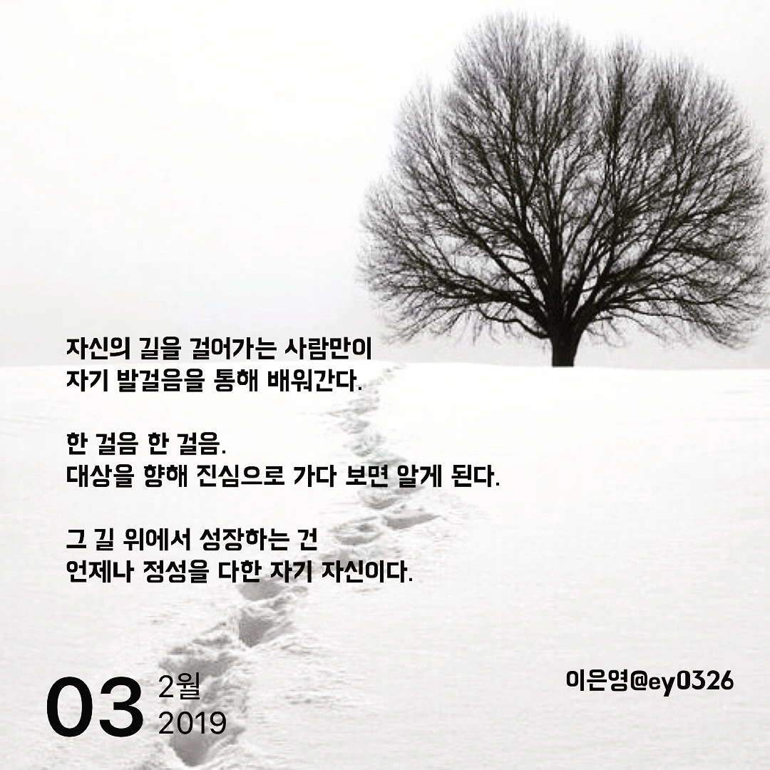자신의 길을 걸어가는 사람만이자기 발걸음을 통해 배워간다.한 걸음 한 걸음. 대상을 향해 진심으로 가다 보면 알게 된다.그 길 위에서 성장하는 건 언제나 정성을 다한 자기 자신이다.
