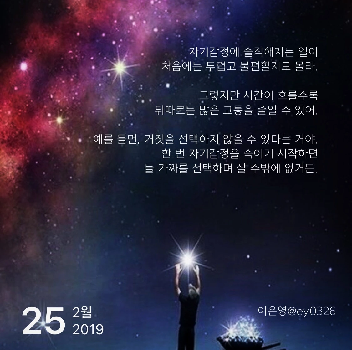 자기감정에 솔직해지는 일이 처음에는 두렵고 불편할지도 몰라. 그렇지만 시간이 흐를수록 뒤따르는 많은 고통을 줄일 수 있어. 예를 들면, 거짓을 선택하지 않을 수 있다는 거야. 자기감정을 속이면 늘 가짜를 선택하며 살 수밖에 없거든.