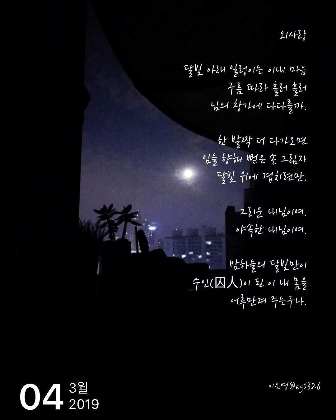 외사랑달빛 아래 일렁이는 이내 마음 구름 따라 흘러 흘러 님의 창가에 다다를까. 한 발짝 더 다가오면 임을 향해 뻗은 손 그림자 달빛 위에 겹치련만. 그리운 내님이여. 야속한 내님이여. 밤하늘의 달빛만이 수인(囚人)이 된 이 내 몸을 어루만져 주는구나.