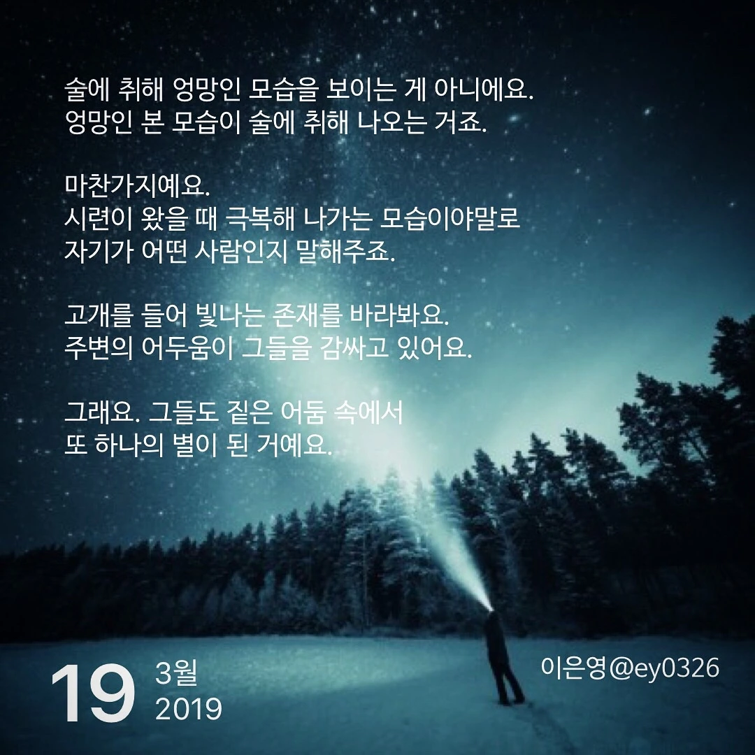 술에 취해 엉망인 모습을 보이는 게 아니에요. 엉망인 본모습이 술에 취해 나오는 거죠.마찬가지예요. 시련이 왔을 때 극복해 나가는 모습이야말로 자기가 어떤 사람인지 말해주죠. 고개를 들어 빛나는 존재를 바라봐요.주변의 어두움이 그들을 감싸고 있어요.그래요. 그들도 짙은 어둠 속에서 또 하나의 별이 된 거예요.