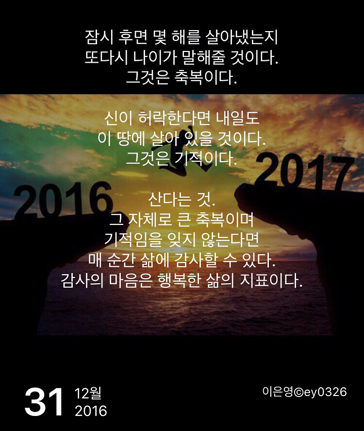 잠시 후면 몇 해를 살아냈는지또다시 나이가 말해줄 것이다.그것은 축복이다.신이 허락한다면 내일도이 땅에 살아 있을 것이다.그것은 기적이다.산다는 것.그 자체로 큰 축복이며기적임을 잊지 않는다면매 순간 삶에 감사할 수 있다.감사의 마음은 행복한 삶의 지표이다.