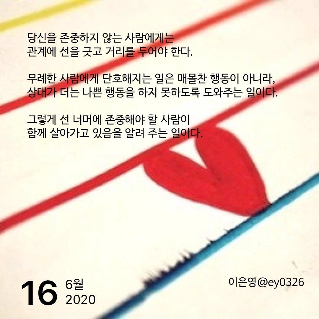 당신을 존중하지 않는 사람에게는관계에 선을 긋고 거리를 두어야 한다.무례한 사람에게 단호해지는 일은 매몰찬 행동이 아니라, 상대가 더는 나쁜 행동을 하지 못하도록 도와주는 일이다.그렇게 선 너머에 존중해야 할 사람이 함께 살아가고 있음을 알려 주는 일이다.