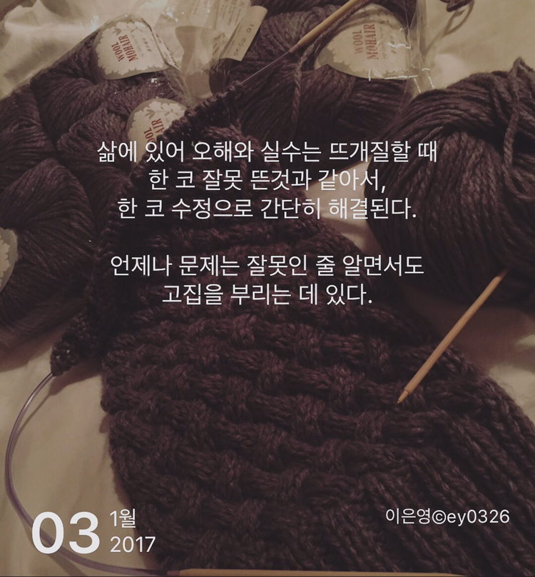삶에 있어 오해와 실수는 뜨개질할 때한 코 잘못 뜬것과 같아서,한 코 수정으로 간단히 해결된다.언제나 문제는 잘못인 줄 알면서도고집을 부리는 데 있다.
