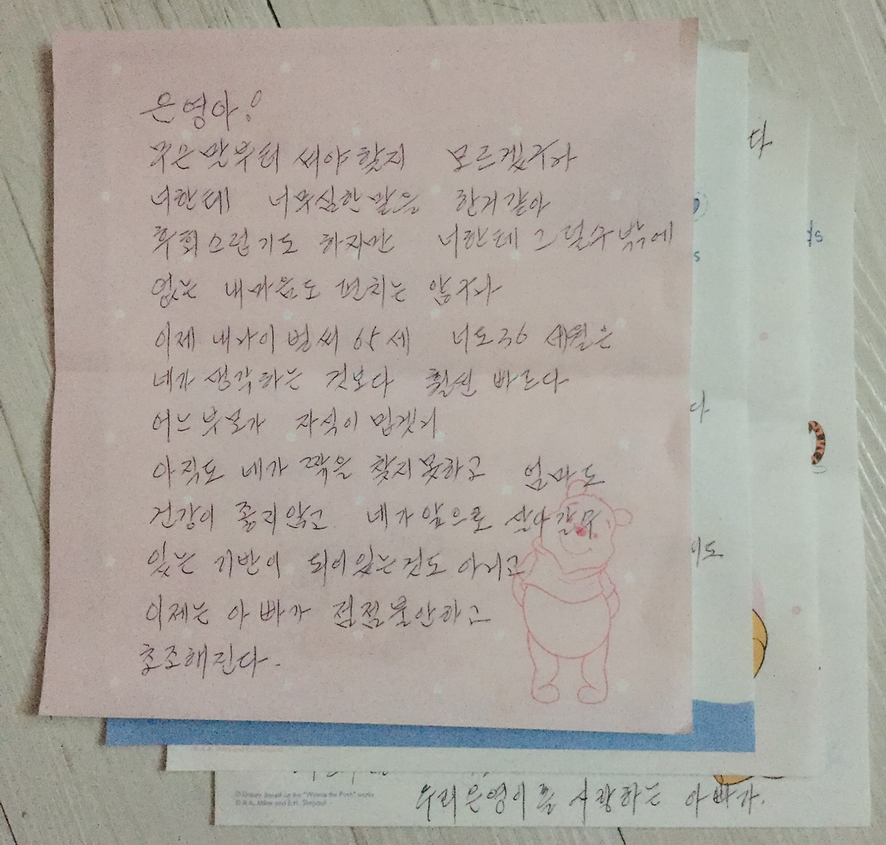 그 모든 일이 오늘에 와서는 과거의 일이 되어버렸지만 후회의 감정은 여전히 현재 진행형이다. 조금 더 지혜롭고 현명하게 대처할 것을. 논리적인 반박이 아닌 아빠의 근심 어린 마음을 헤아려 주는 편이 좋았을 텐데 하는 후회의 마음이 가득하다. 그 순간 책상 위에 낯선 편지지가 보인다.