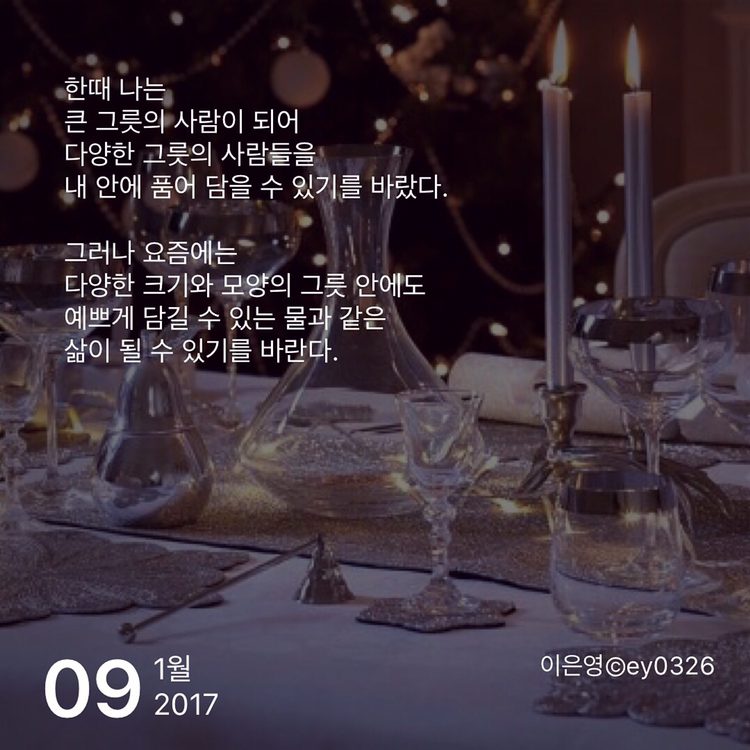 한때 나는큰 그릇의 사람이 되어다양한 그릇의 사람들을내 안에 품어 담을 수 있기를 바랐다.그러나 요즘에는 다양한 크기와 모양의 그릇 안에도예쁘게 담길 수 있는 물과 같은삶이 될 수 있기를 바란다.
