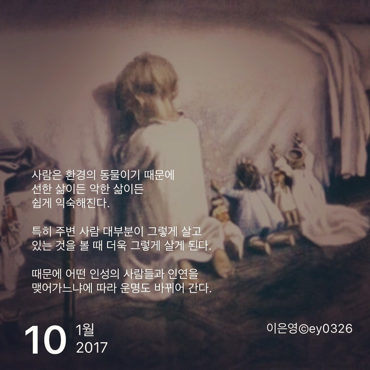 사람은 환경의 동물이기 때문에선한 삶이든 악한 삶이든쉽게 익숙해진다.특히 주변 사람 대부분이 그렇게 살고있는 것을 볼 때 더욱 그렇게 살게 된다.때문에 어떤 인성의 사람들과 인연을맺어가느냐에 따라 운명도 바뀌어 간다.