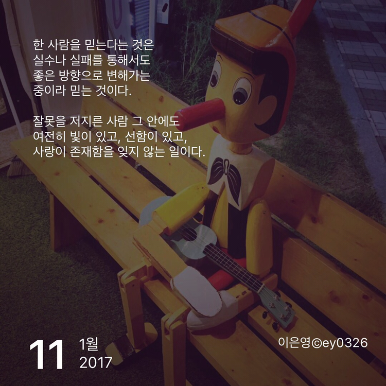 한 사람을 믿는다는 것은실수나 실패를 통해서도좋은 방향으로 변해가는중이라 믿는 것이다.잘못을 저지른 사람 그 안에도여전히 빛이 있고, 선함이 있고,사랑이 존재함을 잊지 않는 일이다.