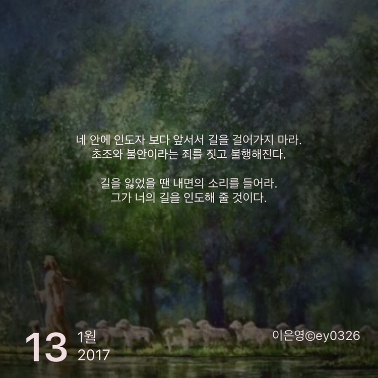 네 안에 인도자 보다 앞서서 길을 걸어가지 마라.초조와 불안이라는 죄를 짓고 불행해진다.길을 잃었을 땐 내면의 소리를 들어라.그가 너의 길을 인도해 줄 것이다.