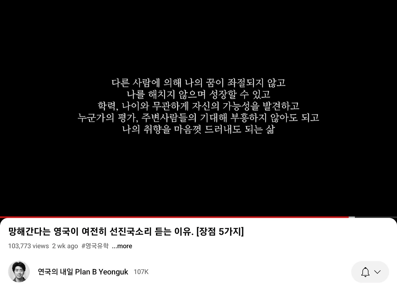 그럼에도 왜 영국에 계속 살아도 좋은지 뚜렷하게 정리해서 답하기 어려웠는데, 유튜버 '연국의 내일'이 내 마음을 알듯이 정리해주었다.