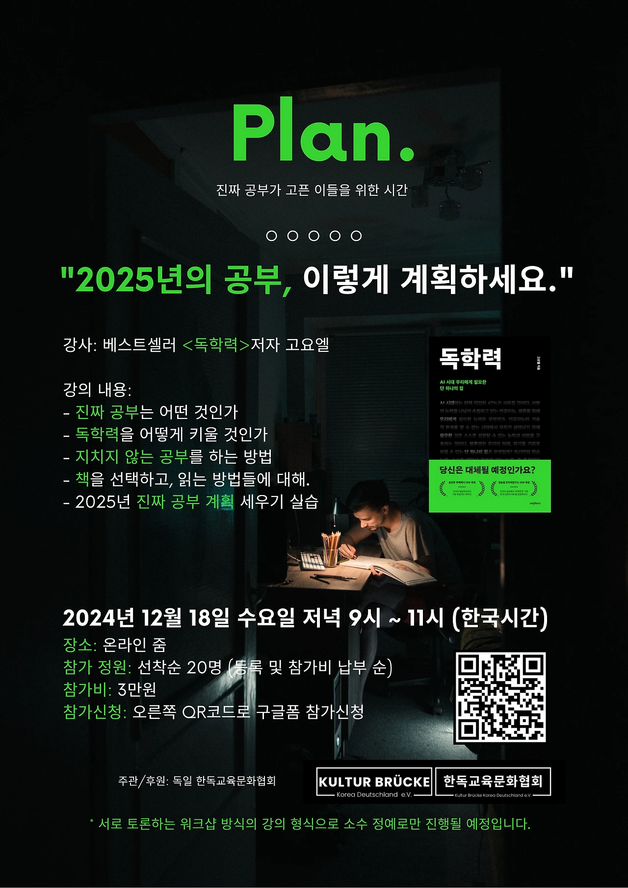 Plan 참가신청서 "2025년의 공부, 이렇게 계획하세요." Plan은 베스트셀러 <독학력> 저자 고요엘 작가와 함께 하는 진짜 공부가 고픈 이들을 위한 온라인 워크숍입니다. 상호 소통하고 토론하며 이루어지는 강의 특