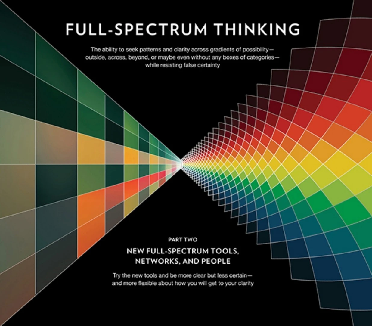 밥 조핸슨은 'Full-Spectrum Thinking'에서 이렇게 말한다. “편을 가르는(Categorical) 사고는 우리를 확신으로 끌어가지만, 명징에서는 멀어지게 한다”. 그리고 그는 책 전체를 통해 하고자 하는 말을 한 문장으로 요약한다. “More clarity, less certainty”.