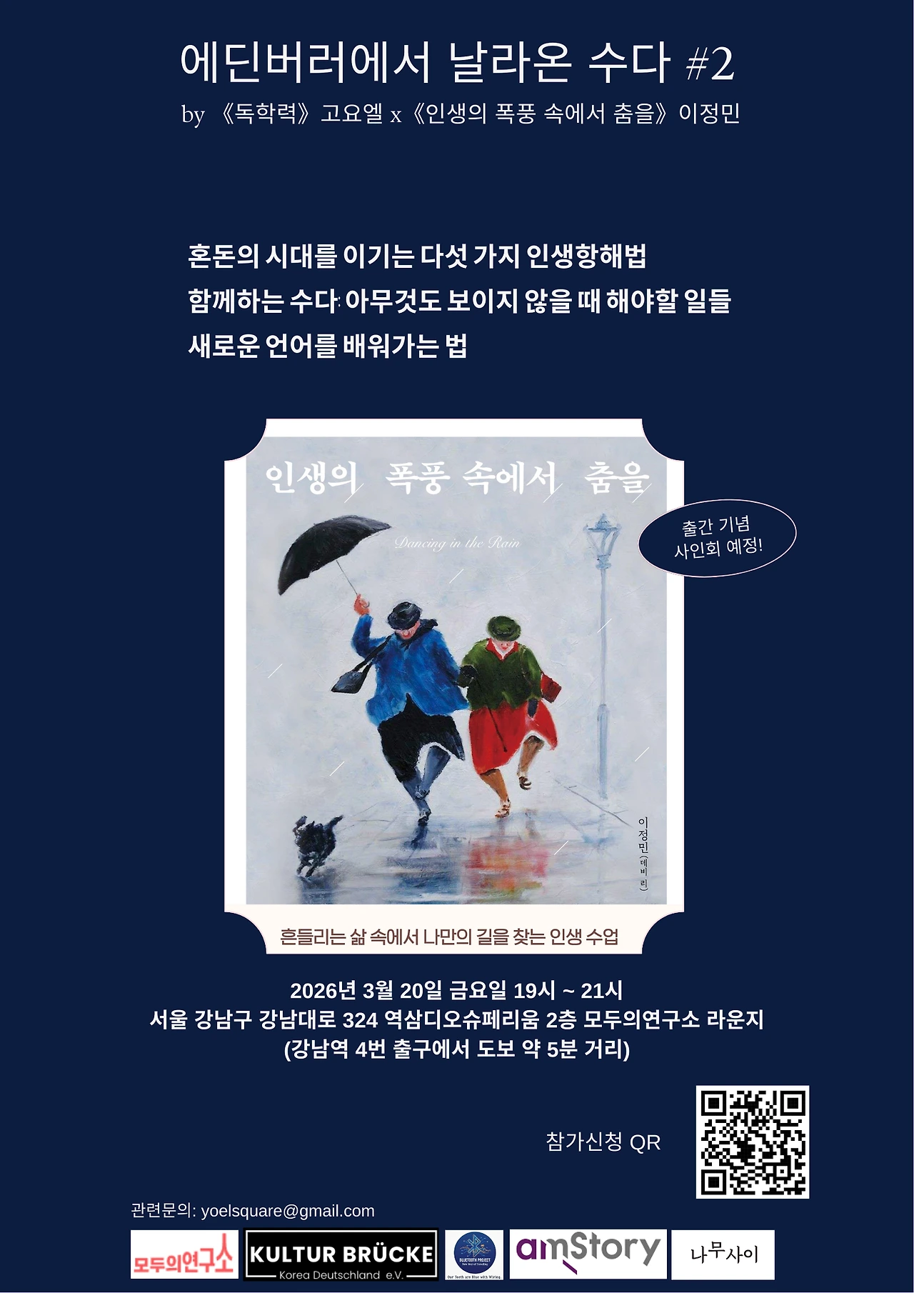 최근 교보문고에서 주목받고 있는 <인생의 폭풍 속에서 춤을>을 저자 이정민 작가님과 함께 북토크를 하게 되었습니다.