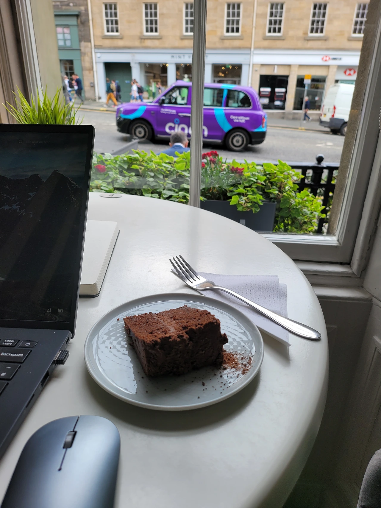 사무실에서 통 집중이 안되어서 까페 나와서 일을 하고 있던 차에, 까페가 누군가의 생일 축하 파티로 떠들썩하다. 잠시 후에, 여성 한 분이 초코 케익 한 조각을 들고 온다.